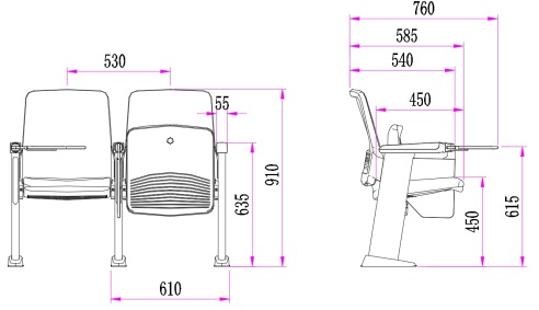 2.座椅基本中心距为530±5mm,座包打开侧深585±5mm,写字板打开侧深760±5mm,基本椅高为910±5mm,最小排距:850mm。